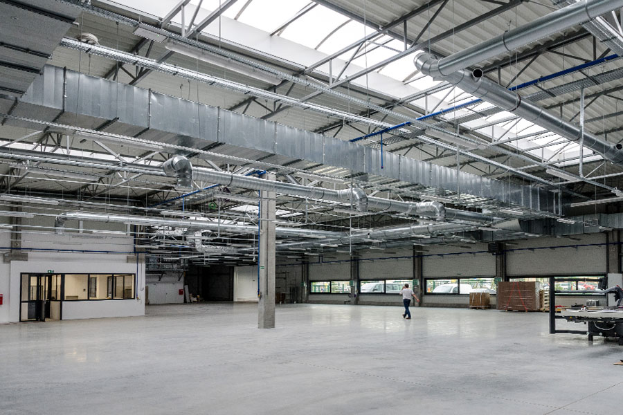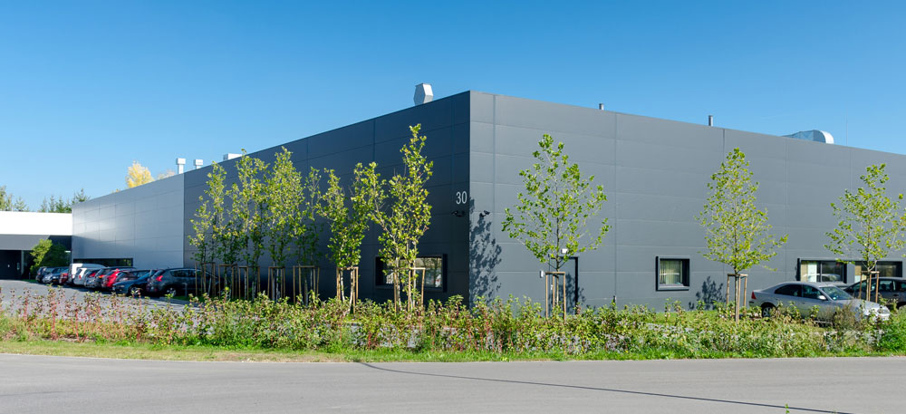 An office building with a warehouse and production hall